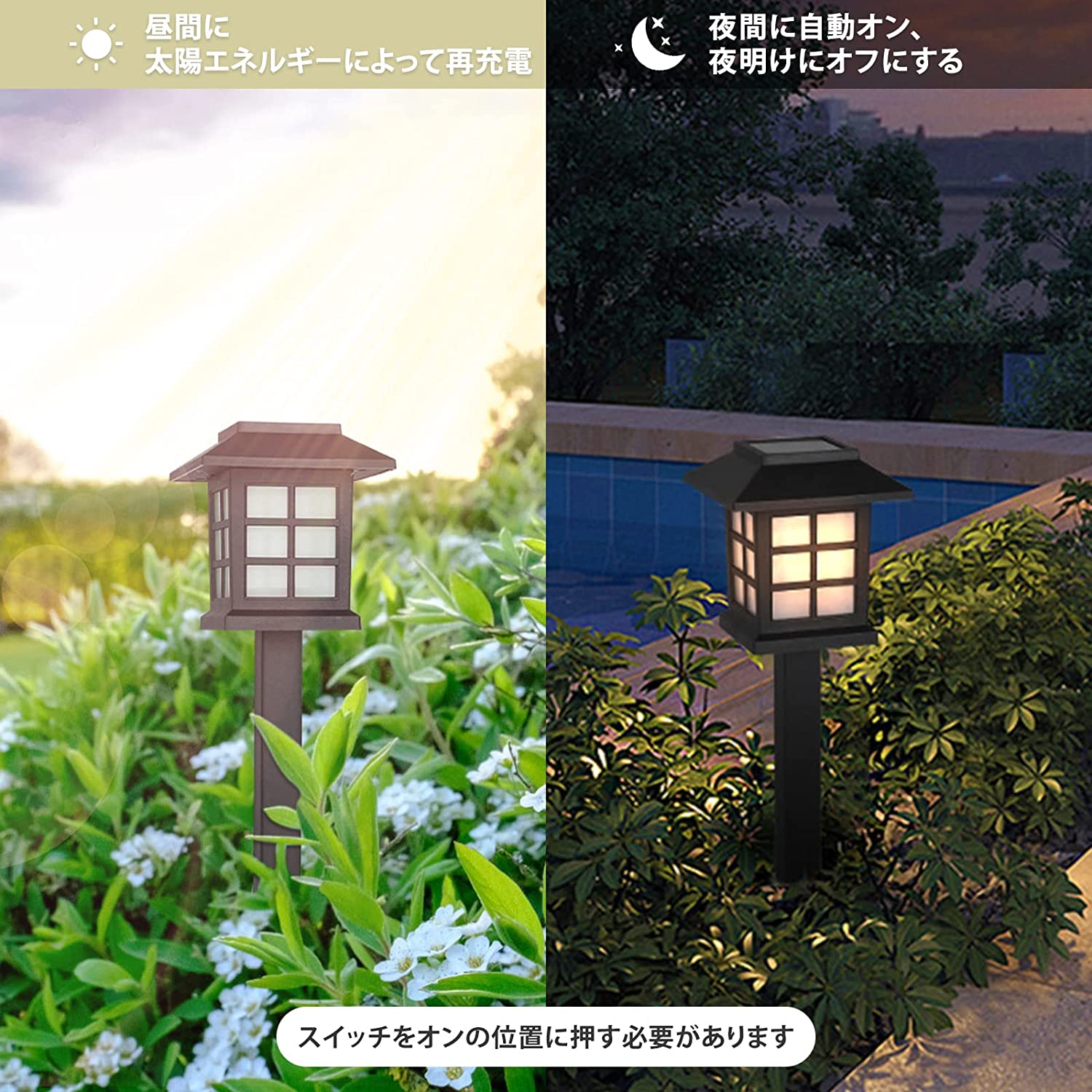 【光センサーで自動点灯と消灯】--光センサー内蔵で自動点灯と自動消灯できます。暗闇や夜間に自動的に点灯でき、昼間や明るい場所では自動的に消灯になります。ライトを設置前まずはスイッチをonにしてください。爽やかなウォーミング光より、いきいきとした雰囲気を作られ、いい夜散歩できるように。