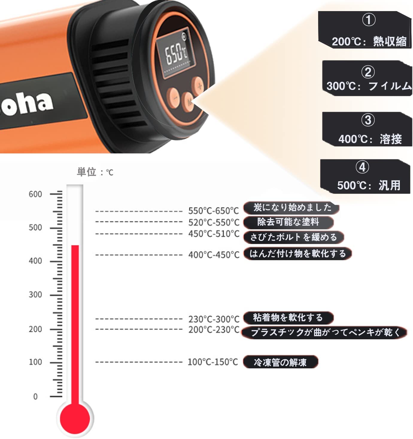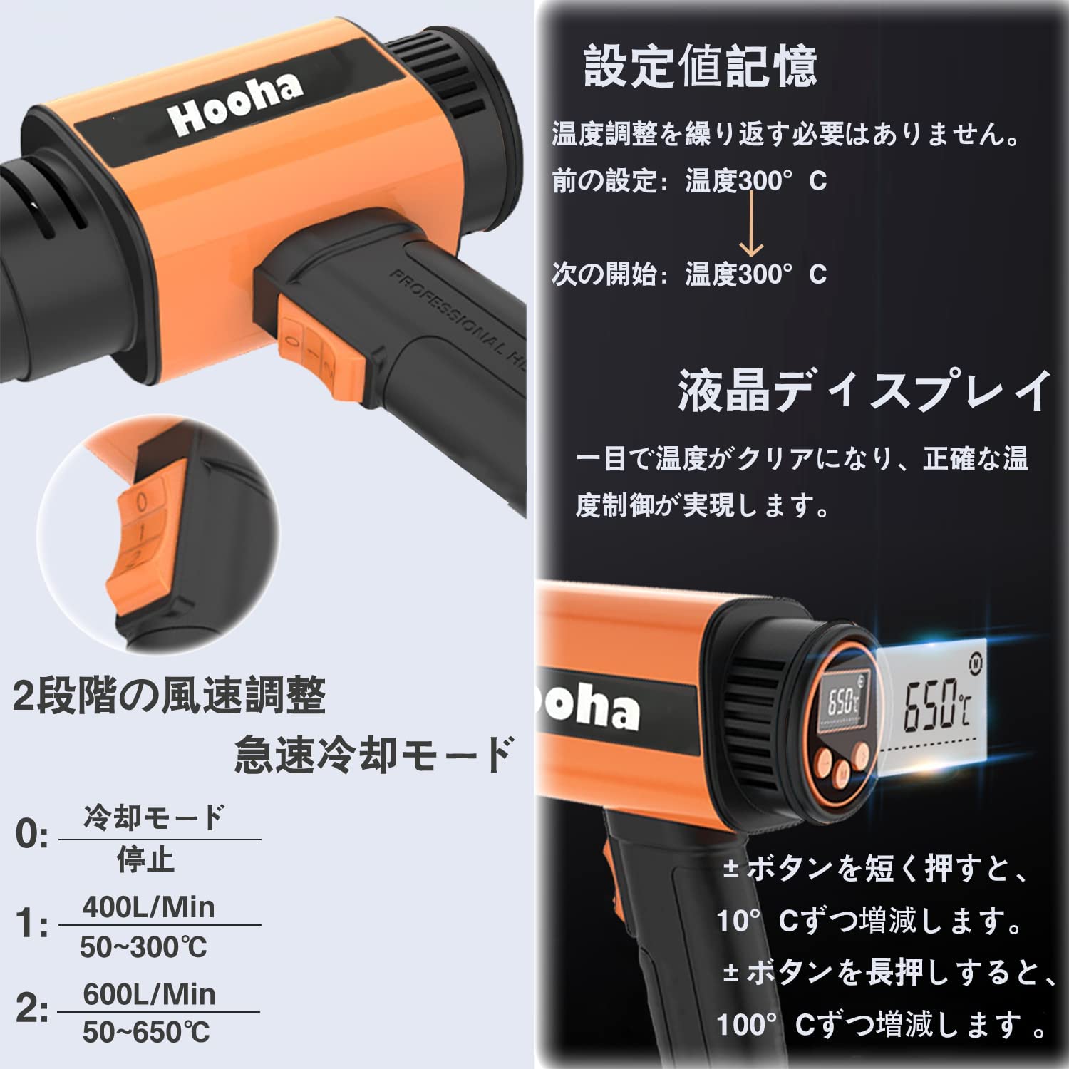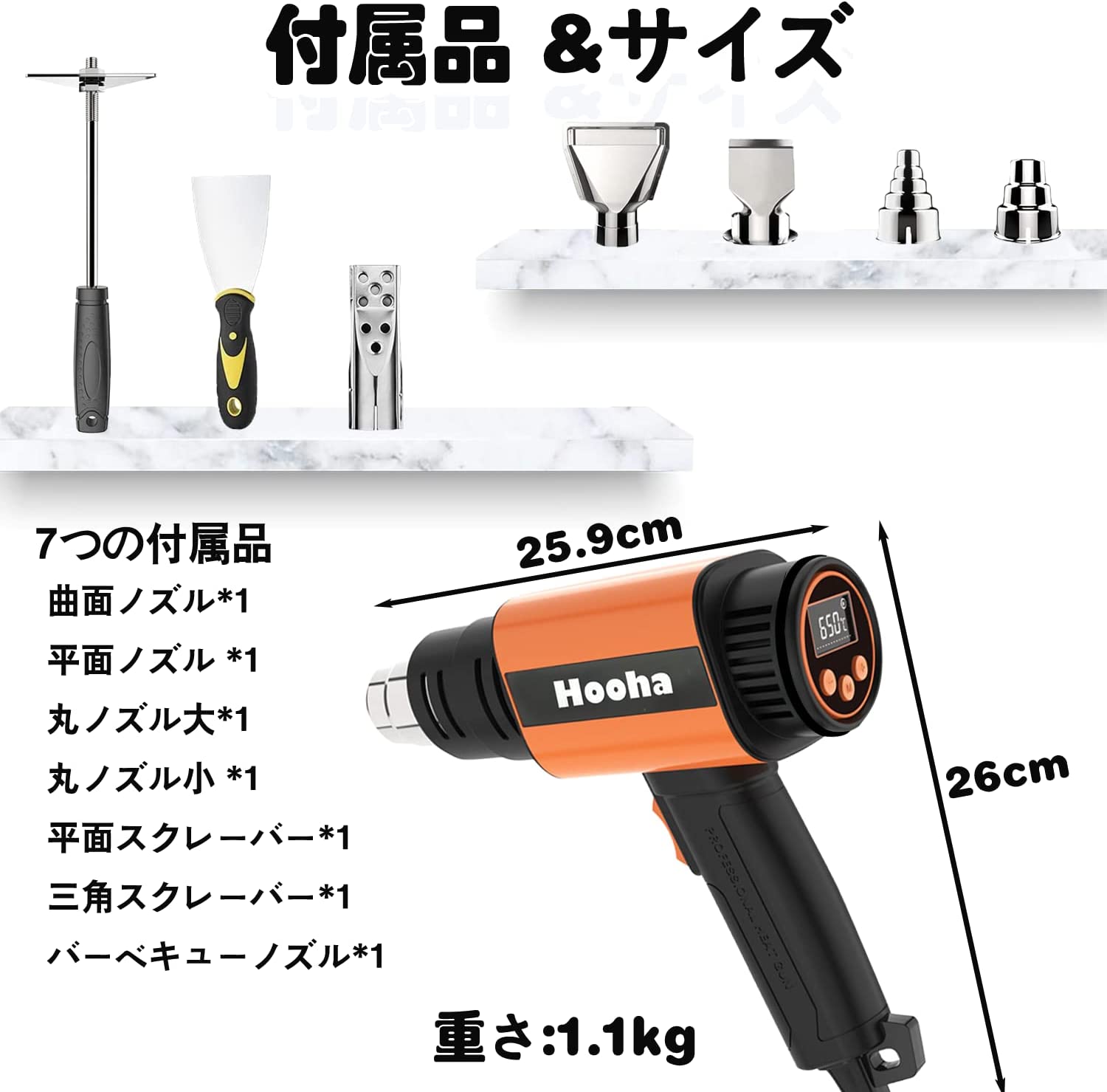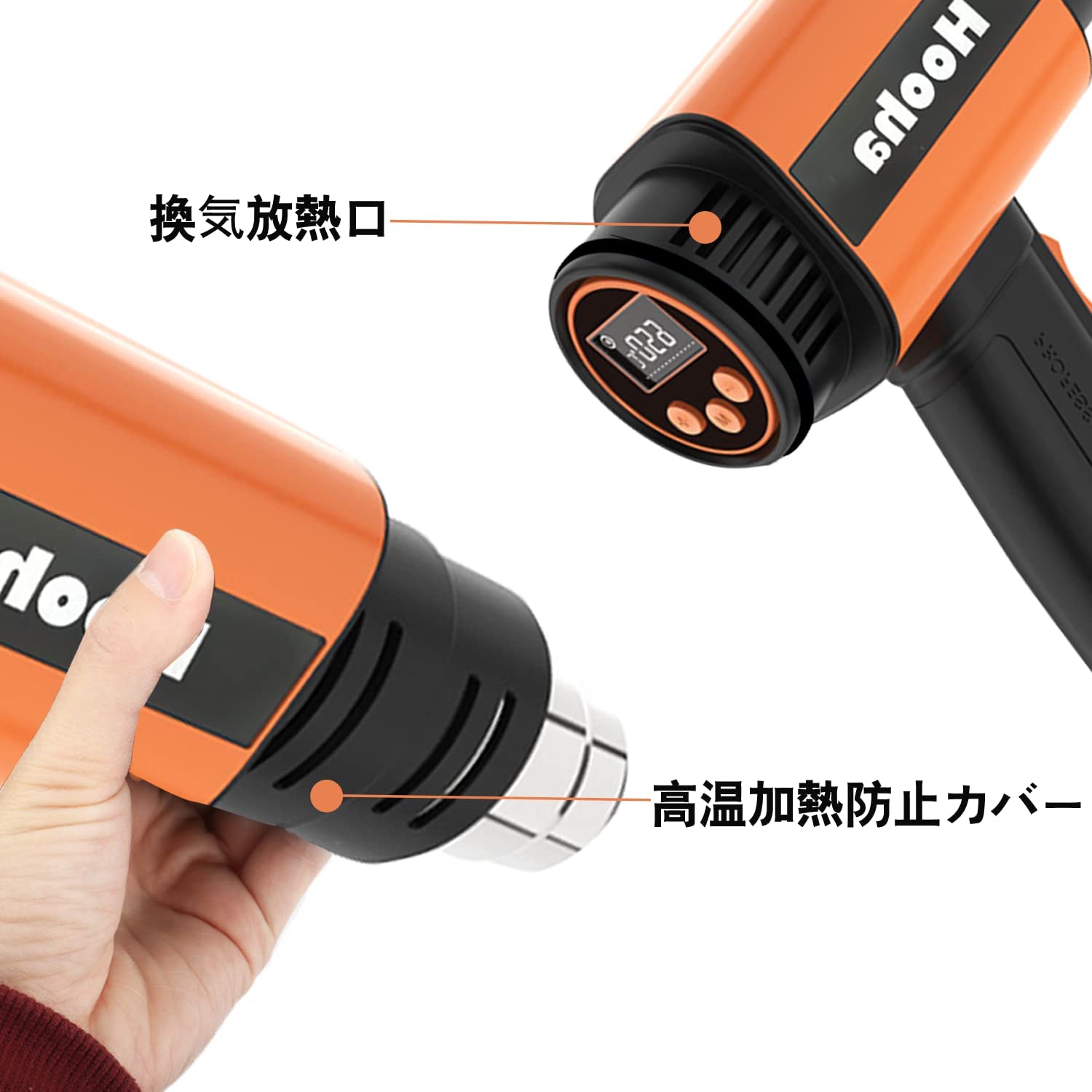 ヒートガン ホットガン 小型 1800W 50-650℃ 液晶に温度調整 デジタル温度表示 無段階調温 2段階風速 10秒間急速冷却 急速加温 設定値記憶 ノズル5本付き 2種類のスクレーパ付き 多用途ヒートがん DIY作業用 軟化 溶接 加工 熱処理 乾燥 剥離 塗料 修理 補修 熱風機 水道管凍結防止ヒーター 日本語取扱説明書付 PSE認証
