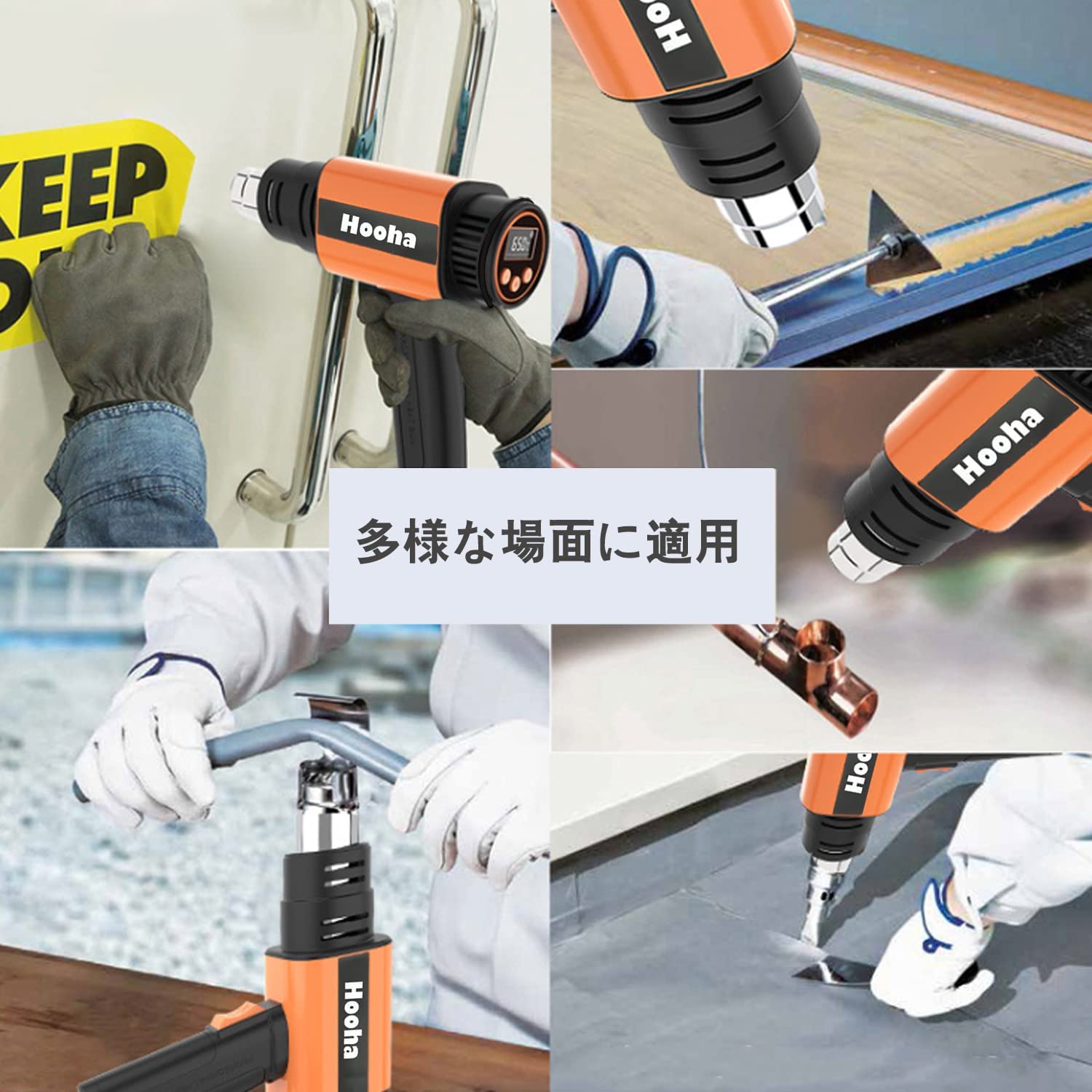 【豊富な付属品・多用途】このヒートガンセットは7つの多種類アタッチメントを付属しています。曲面ノズル*1、平面ノズル *1、バーベキューノズル*1、丸ノズル大*1、丸ノズル小 *1、平面スクレーバー*1、三角スクレーバー*1。塗装・ステッカー剥離作業、収縮フィルム収縮作業、熱収縮チューブ・PVCパイプ加工作業、DIY作業、カーフィルム、錆びたボルト緩み、融雪、冷蔵庫解凍、水管解凍などの乾燥・熱処理に最適仕事。