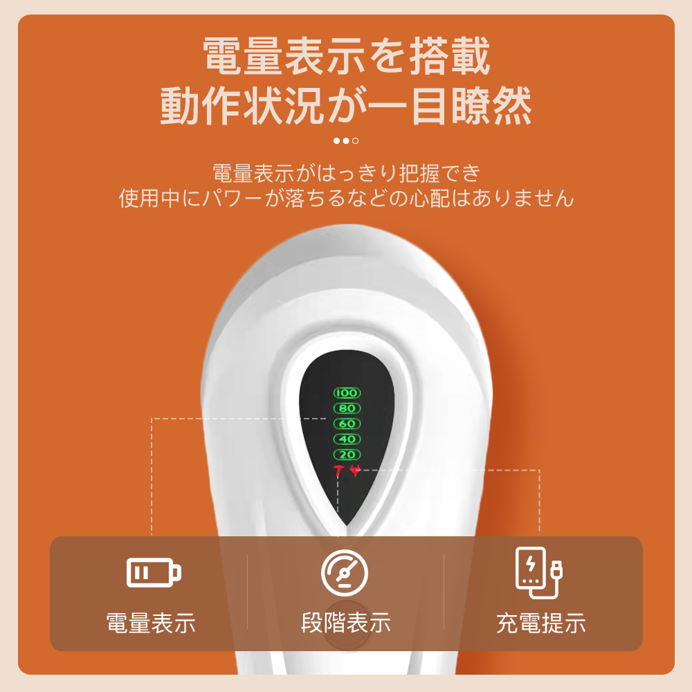 従来の毛玉取り器と比べて、新型毛玉取り器は電子ディスプレイ機能を備えています。スイッチをオンにすると、電量指示と段階調節がはっきり把握でき、使用中にパワーが落ちるなどの心配はありません。
