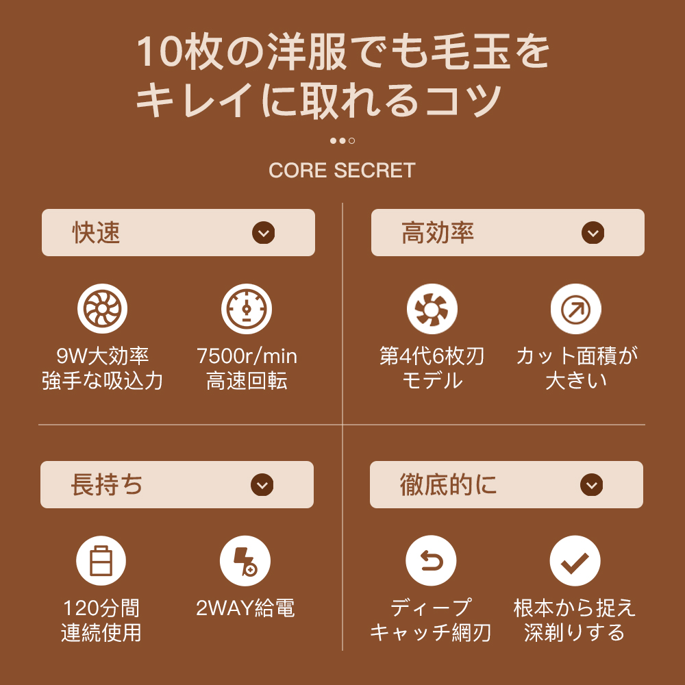 この新型毛玉取り器はおしゃれな外観に良い握り心地に加え、画面を表示する電子ディスプレイと超大容量のダストボックスも付いています。56mmの超大型カッターヘッドで、通常の毛玉取りより取る範囲が広く、様々な毛玉を短時間で手軽に取ることができます。 急いで外出されようとする時でも、2分間だけで服をリフレッシュします。