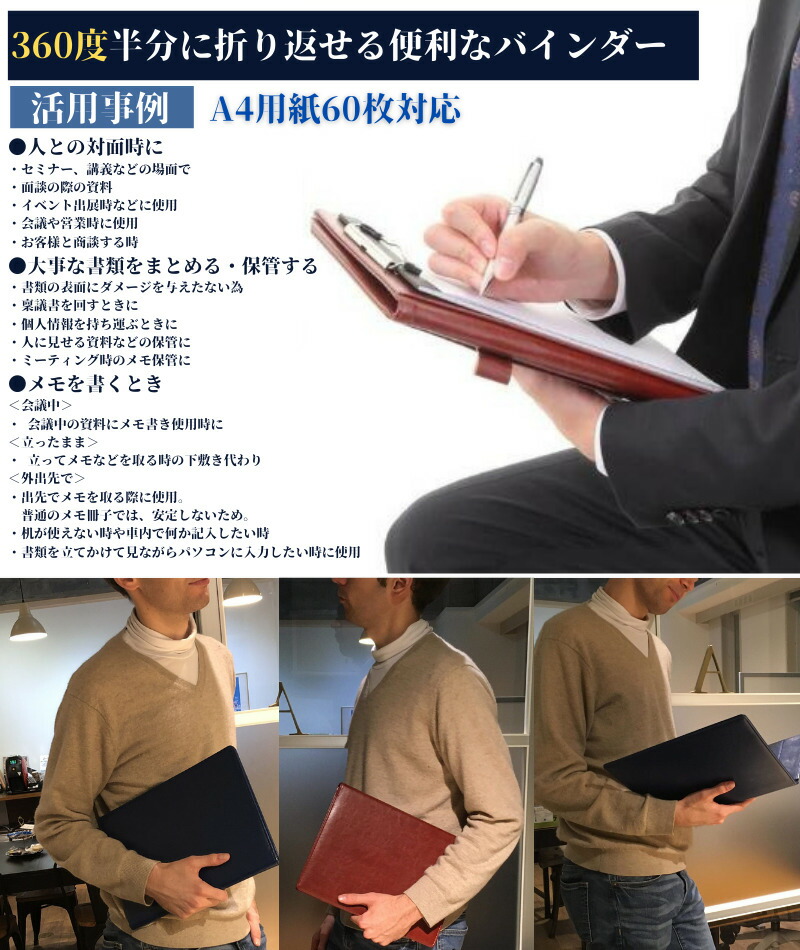 表紙を360°折り返すことができるので立ったままでも片手でしっかり支えて書くことが可能。会議や授業はもとより屋外での打ち合わせにも重宝しシーンを選ばずお使い頂けます。