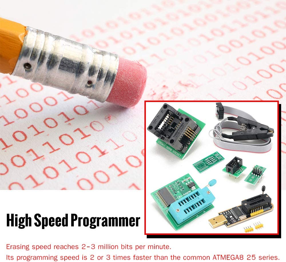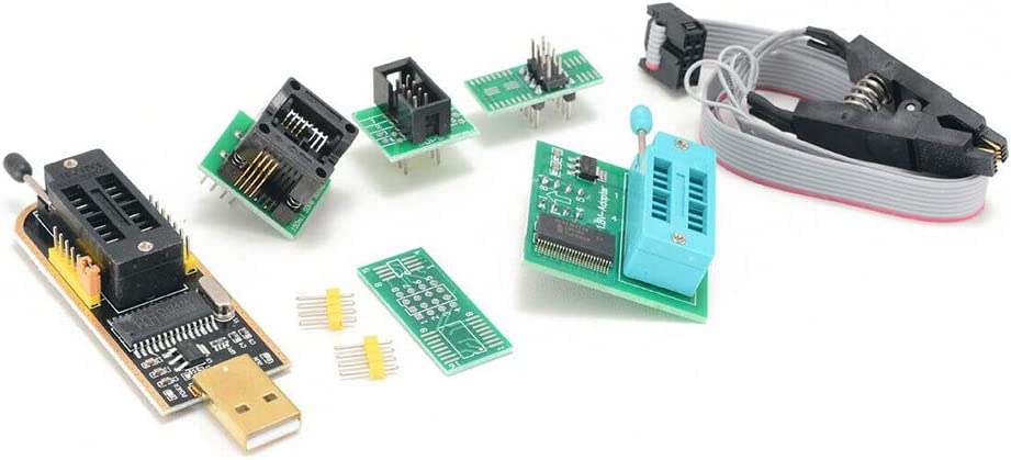 CH341A USBプログラマーキットには、SOP8フラッシュクリップ、150mil SOP8ソケット、1.8Vアダプター、8pin / 16pinチップなどが含まれています。