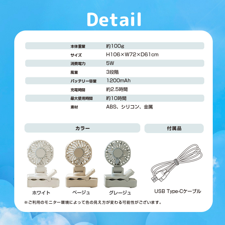角度調整が自在で、歩きながらでも座りながらでも、いつでもどこでも涼しい風を届けます。