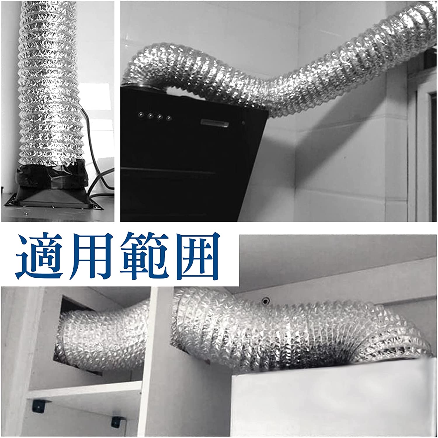 ダクトホース用途:レンジフード、エアコン、換気扇、送風機。ダクトホース耐久性、柔軟性、経済性に優れた素材と、フレキシブルで剛性・強度を持つ構造により、効率的な移送・輸送システムを実現できます。